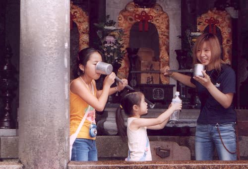 音羽の滝で、ペットボトルに水をせがむ愛海