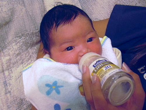このミルクは一ビンで一回分、ふたを開け、使い捨ての吸い口を付けるだけ
