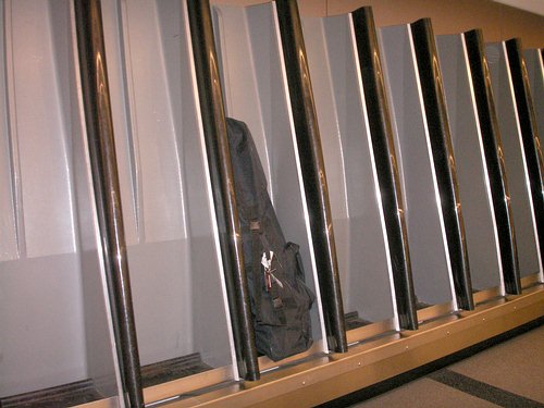 デンバー空港ではスキー、スノーボード、ゴルフバックの専用搬送機がある。